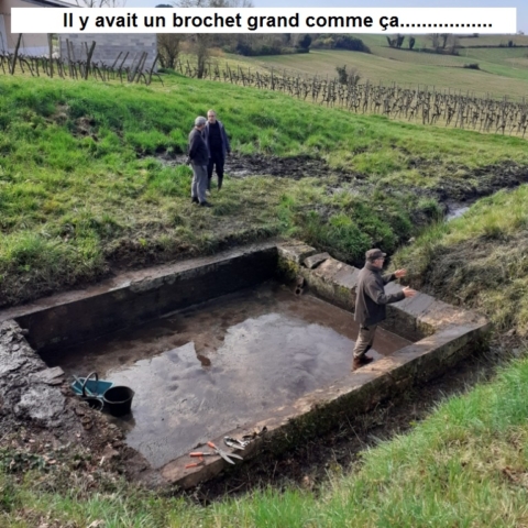 Une fois la source dégagée, il a fallu la vider pour la nettoyer. C’est ainsi qu’un beau brochet a été retiré de la source et remis en liberté dans un étang.